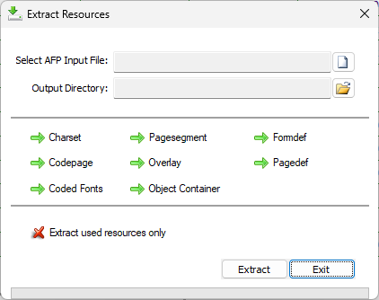The Extract Resources tool extracts the embedded resources from an AFP file. By default, all resource types are extracted.