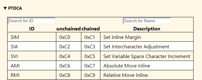 - List of PTOCA, GOCA, and IOCA commands with search options: