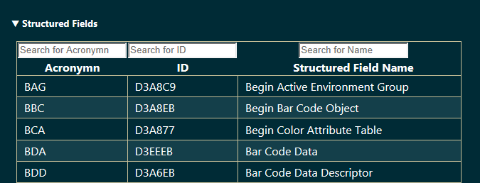 - List of Structured Fields and Triplets with search options: