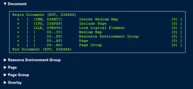 - Structure of AFP MO:DCA objects like Print File, Resource Group, Resource Objects, Document, Page, Images, etc.