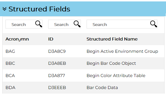 The reference tabs show the list of structured fields, triplets, PTOCA, GOCA and IOCA commands. By default they are sorted by name. Click on the column headers to sort them differently.