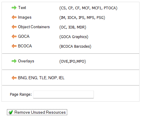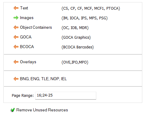 This option leaves only the text, removing all images, barcodes, GOCA graphics, object containers, non-printable information, and unused resources.