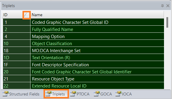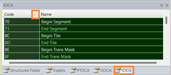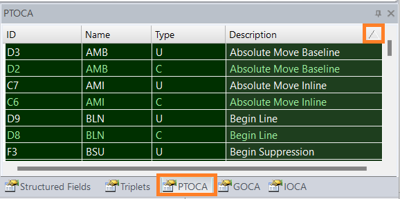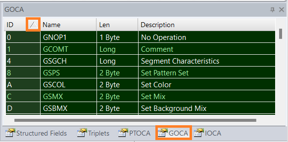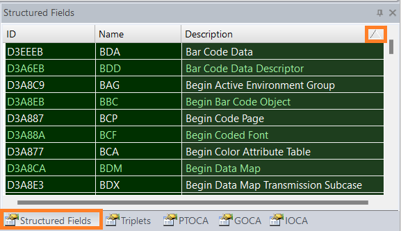 The reference tabs show the list of structured fields, triplets, PTOCA, GOCA and IOCA commands. By default they are sorted by name. Click on the column headers to sort them differently.