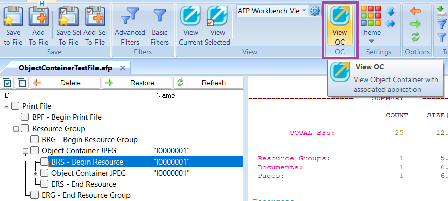 Object containers like TIFF, JPEG, PDF, TrueType fonts and others can be viewed in their respective applications installed on the system. Click on any Object Container Structured field from the Tree-View. This will enable the View OC but on the toolbar. Click this button to open the object container in its associated application.